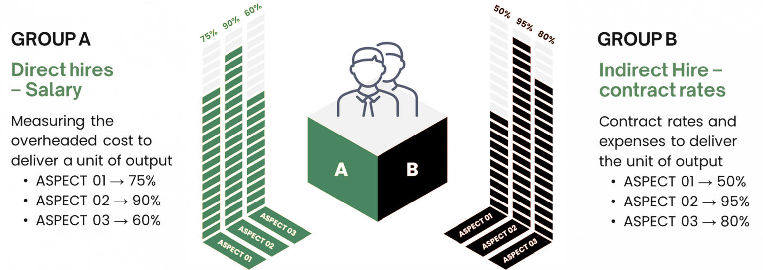 Tracks direct and indirect hires, provided fully overheaded costs are included.